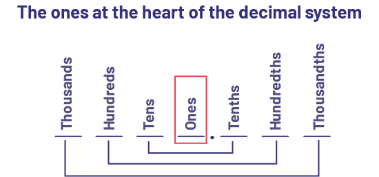It is essential that students recognize the position of the ones, since it defines the whole, from which the tenths, hundredths and thousandths are formed on the one hand, and the tens, hundreds and thousands on the other. We can therefore say that the ones, identified by the decimal point, is at the heart of the decimal system, and there is symmetry around it.