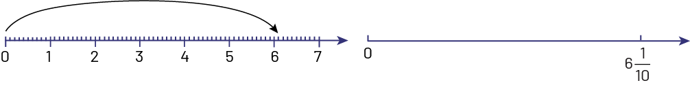 Since the situation deals with a linear measurement, students can use a linear model, such as a number line. The first step is to locate \(6\frac{1}{{10}}\) on a number line (left) or an open number line (right),