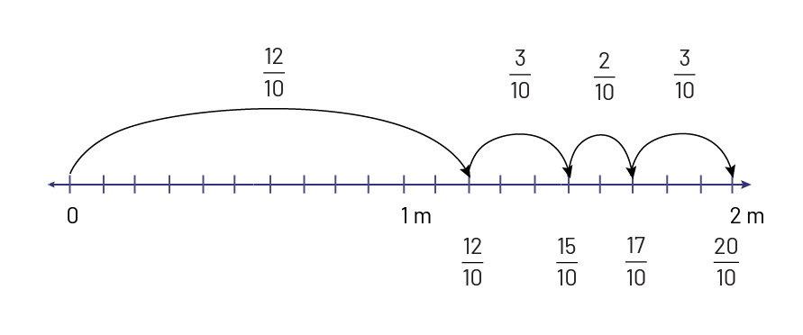 Thus, we can conclude that William must run \(2\frac{8}{{10}}\) km. We therefore have \(6\frac{1}{{10}}\; - \;3\frac{3}{{10}}\; = \;2\frac{8}{{10}}\).