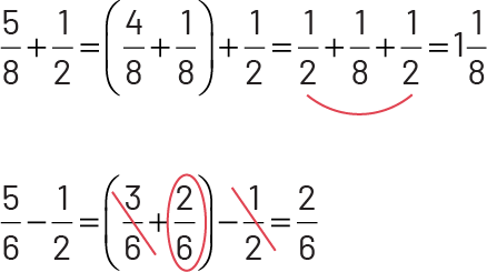 (for example, \(\frac{1}{2}\; + \;\frac{3}{4}\; = \;1\frac{1}{2}\)) knowing that the 3 fourths are composed of 1 half and 1 fourth, the 2 halves are combined to make a whole, then 1 fourth is added.