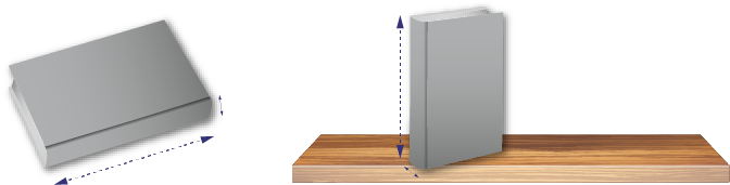 Two images: the first is of a book laid horizontally. A dotted line measures the longest side of the book and another measures the thickness. The second image is of a book placed vertically on a shelf. One dotted line measures the longest side of the book and another measures the thickness.Source: translated from Fiche de la 4e à la 6e année, Attribut longueur, p. 2.