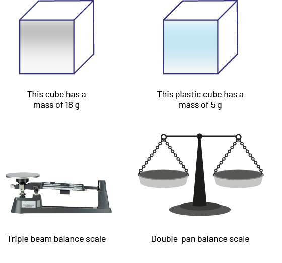 image There are four illustrations: a cube of matter, a plastic cube, a triple beam scale, and a double pan scale. Under the first cube is written: this cube of matter has a mass of 18 grams. Under the second cube is written: this cube of plastic has a mass of five grams. Under the first scale is written: triple beam scale. Under the second scale is written: double scale.