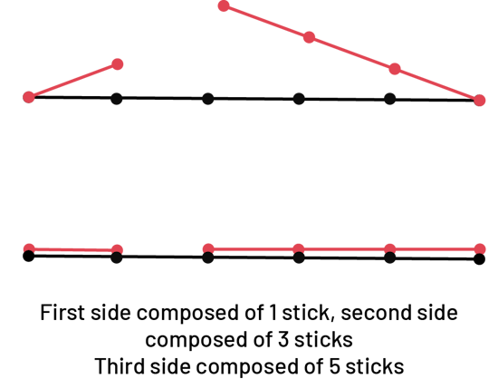 image A segment of six horizontal rods. There are two segments of, one and three sticks, respectively, diagonal up from the ends of the first segment. The two sticks do not meet. Under the first set of sticks, there are three horizontal segments, of one, three and five sticks. Under the image is written: sides of one, three and five sticks