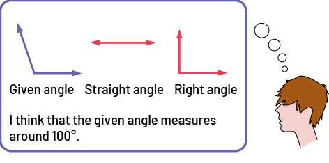 To estimate the measurement of a given angle, students can use the right angle and the flat (straight) angle as benchmarks. By mentally superimposing the image of these angles on the given angle, they can conclude that its measurement is much closer to 90° than to 180°. They then estimate that the measurement of the given angle is about 100°. image In a rounded rectangle, there are three angles: a given angle which is formed by a short vertical line and a short diagonal line to the left, a flat angle, and a right angle. At the bottom of the rectangle is labeled: I believe that the given angle measures about one hundred degrees. Outside the rectangle, there is a character. |