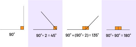 image There are four different corners. The first two have a geometric tile mosaic in the corner. The last two have two geometric mosaics in the shape of a tile in the corner. Under the first angel is written: 90 degrees. Under the second corner is written: 90 degrees divided by two equal to 45 degrees. Under the third angle is written: 90 degrees plus ( open parenthesis) 90 degrees divided by two ( close parenthesis) equal to 135 degrees. Under the fourth image is written: 90 degrees plus 90 degrees equals 180 degrees.