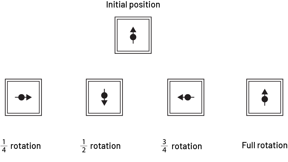 Image a series, of five squares, with a rotation point. Below the first square is written: starting position. Under the second square is written: quarter-turn rotation. Under the third square is written: half-turn rotation. Under the fourth square is written: three-quarter-turn rotation. Under the fifth square is written: complete rotation.