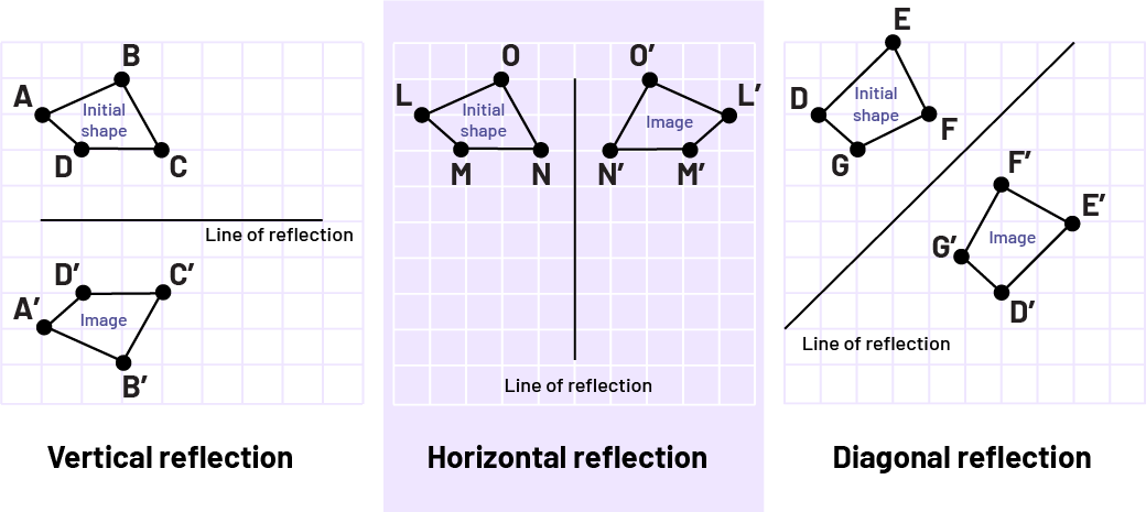 Image there are three grids representing a vertical reflection, a horizontal reflection, and an oblique reflection. In the first grid, there are two figures, the initial figure and the image, of one side each of a horizontal line, being the line of reflection. In the second grid, there are two figure, the initial figure and the image, or one side each of a vertical line, being the line of reflection. In the third image, there are two figure, the initial figure and the image, of one side each of an oblique line, being the line of reflection.