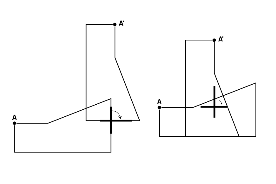 Image There are three figures. The first is marked by a point “ a ” at one of the peaks. The second figure is marked by a point “ a ” prime. The third figure is inversed and marked by a point “ a ” double prime. The second and third figures are linked by two lines of different lengths which intersects at a rotation point. Under the two first figures, there is a horizontal arrow.