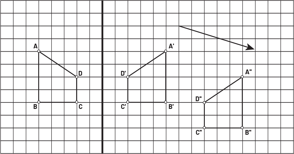 Image there is a grid divided in two sections. In the first section, there is a figure marked by the points “ a ”, “ b ”, “ c ” and “ d ”. On the other side, there is an inversed figure to the one on the first side, marked by the points “ a “ prime, “ b ” prime, “ c ” prime et “ d ” prime. To the diagonal, there is a second congruous figure marked by the points “ a ” double prime, “ b ” double prime, “ c ” double prime and “ d ” double prime. Below, there is an oblique arrow to the right.