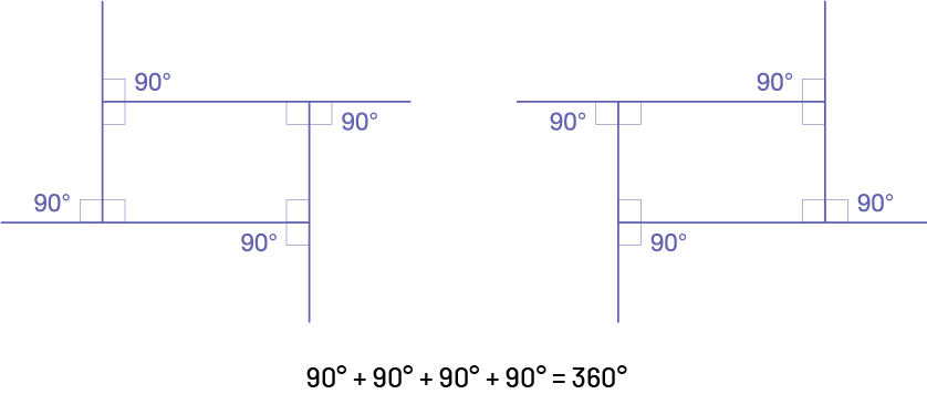 Image there are two identical rectangles in which the angles are measured counter-clockwise to the needles of a watch in the first figure, and clockwise in the needles of a watch in the second. Below the figure is written: 90 degrees plus 90 degrees plus 90 degrees plus 90 degrees equals 360 degrees.