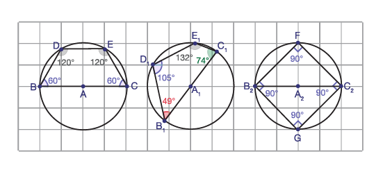 Image this is a grid on which there are three circles. The is a quadrilateral is each individual circle: the first one has two angles of 120 degrees and two angles of 60 degrees; the second one has an angle of 105 degrees, an angle of 132 degrees, an angle of 74 degrees, and an angle of 49 degrees; the third one has three angles of 90 degrees.