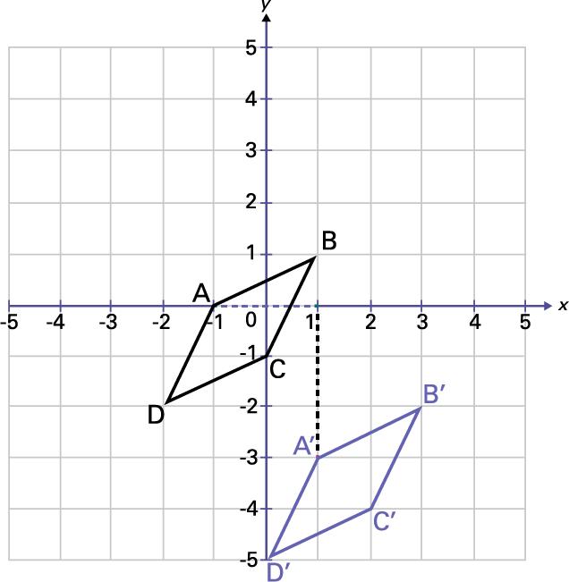 image On a Cartesian plane, the ordinate « y » is from 5 to minus 5, the abscissa « X » is from minus 5 to 5. The figure« A » « B » « C » « D » is placed on the Cartesian plane. Point « A » is at (opening parenthesis) zero, minus one (closing parenthesis), point « B » (opening parenthesis) one, one (closing parenthesis, point « C » is at (opening parenthesis) minus one, zero (closing parenthesis). And the point « D » (opening parenthesis) minus 2, negative 2 (closing parenthesis). The translation of the parallelogram is « A » prime (opening parenthesis) one, one (closing parenthesis), « B » prime (opening parenthesis) 3, minus 2 (closing parenthesis), « C » prime (opening parenthesis) 2, minus 4 (closing parenthesis), « D » prime (opening parenthesis) zero, negative 5 (closing parenthesis).