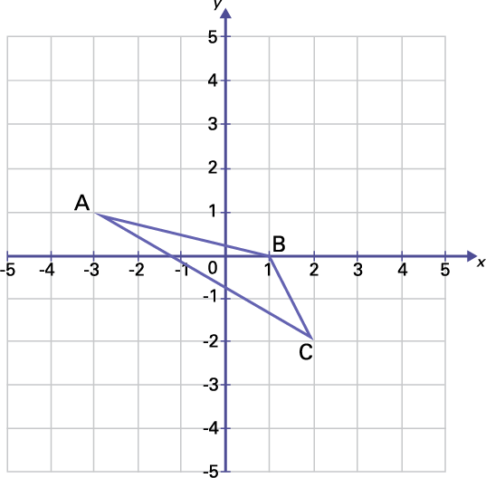 image A triangle « A » « B « C » is placed on a Cartesian plane at the following coordinates. « A » (opening parenthesis) minus 3, one (closing parenthesis), « B » (opening parenthesis) one, zero (closing parenthesis), « C » (opening parenthesis) 2, negative 2 (closing parenthesis)