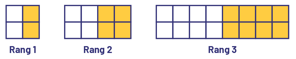 Le changement et les régularités sont deux concepts indissociables dans l’exploration des relations entre deux quantités en changement. Les élèves réalisent que le changement d’une quantité influe sur une autre. Par exemple, en observant la suite croissante ci-dessous, les élèves peuvent reconnaître le changement d’un rang à l’autre, soit que le nombre de carrés augmente d’un rang à l’autre. En poussant l’analyse du changement, les élèves peuvent reconnaître que le nombre de carrés double à chaque rang.