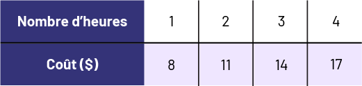 En général, les élèves relèvent qu’au centre d’entraînement Méga, la somme déboursée augmente de 2 $ chaque fois que Jessie prend part à un cours, tandis qu’au centre d’entraînement Extra, elle augmente de 5 $. En analysant davantage la situation, les élèves peuvent reconnaître qu’il y a une relation entre la somme déboursée et le nombre de cours à chaque centre d’entraînement.