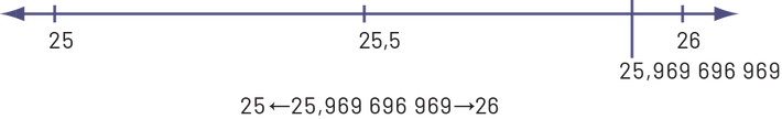 Image Une droite numérique est graduée de 25 à 26 avec intervalle de zéro virgule cinq. Sous 25 virgule cinq, le nombre 25,969 696 969 pointe le nombre 25 vers la gauche et le nombre 26 vers la droite. Il est également situé sur la droite, près du nombre 26 à sa gauche.