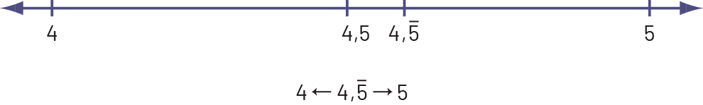 Image Une droite numérique est graduée de quatre à cinq avec intervalle de zéro virgule cinq. À côté de quatre virgule cinq, il est écrit quatre virgule cinq où le cinq est surmonté d’un trait horizontal. En dessous, le chiffre quatre virgule cinq avec le cinq surmonté d’un trait horizontal pointe le chiffre quatre vers la gauche et le chiffre cinq vers la droite.