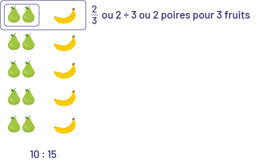 - 10 poires pour 15 fruits ou 10:15 ou \(\frac{{10}}{{15}}\) ou \(\frac{2}{3}\)