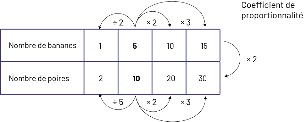 Image Un tableau possède deux rangées de cinq cases. Première rangée : Nombre de bananes, un, cinq, dix, 15. Une flèche relie cinq à un en indiquant divisé par deux. Une flèche relie cinq à dix en indiquant fois deux. Et une flèche relie cinq à 15 en indiquant fois trois. Deuxième rangée : Nombre de poires, deux, dix, 20, 30. Une flèche relie dix à deux en indiquant divisé par cinq. Une flèche relie dix à 20 en indiquant fois deux. Une flèche relie dix à 30 en indiquant fois trois. Et une flèche relie le 15 de la rangée du haut et le 30 de la rangée du bas en indiquant fois deux. À côté du tableau, il est écrit : Coefficient de proportionnalité.