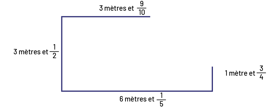 Image Un rectangle incomplet présente ses mesures. Le côté vertical gauche indique trois mètres et demi. Le côté horizontal supérieur, qui est incomplet, indique trois mètres et neuf dixièmes. Le côté vertical droit, qui est incomplet, indique six mètres et un cinquième. Et le côté horizontal inférieur indique six mètres et un cinquième.