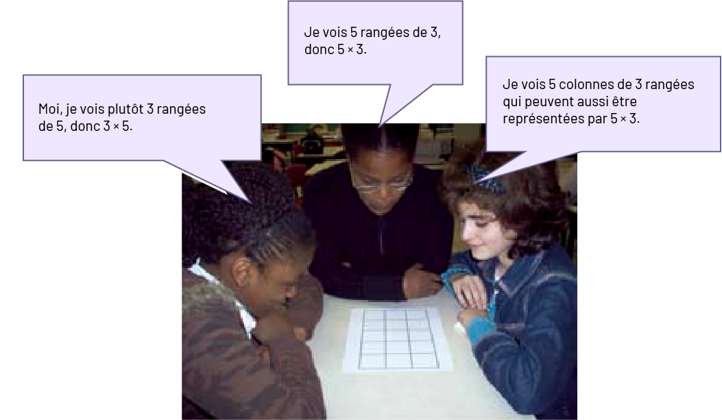 Image Trois élèves autour d’une petite table observent la même image sur une feuille de papier. La première affirme : « Je vois cinq rangées de trois, donc cinq fois trois. ». La seconde répond : « Je vois cinq colonnes de trois rangées qui peuvent aussi être représentées par cinq fois trois.» La troisième rétorque : « Moi, je vois plutôt trois rangées de cinq, donc trois fois cinq. »