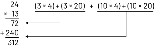 Image L’équation suivante est présentée verticalement : 24 fois 13 égale 72 plus 240 égale 312. À côté, l’opération suivante pointe avec une flèche au résultat 72 : parenthèse ouvrante trois fois quatre parenthèse fermante plus parenthèse ouvrante trois fois vingt parenthèse fermante. Cette opération s’additionne à la suivante, qui elle pointe avec une flèche vers « plus 240 égale 312 » : parenthèse ouvrante dix fois quatre parenthèse fermante plus dix fois vingt parenthèse fermante.