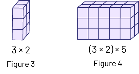 On peut aussi considérer la figure 3, qui illustre 3 étages de 2 cubes, soit \(3\; \times \;2\) cubes. La figure 4 peut alors représenter \(\left( {3\; \times \;2} \right)\) cubes qui paraissent 5 fois, soit \(\left( {3\; \times \;2} \right)\; \times \;5\).