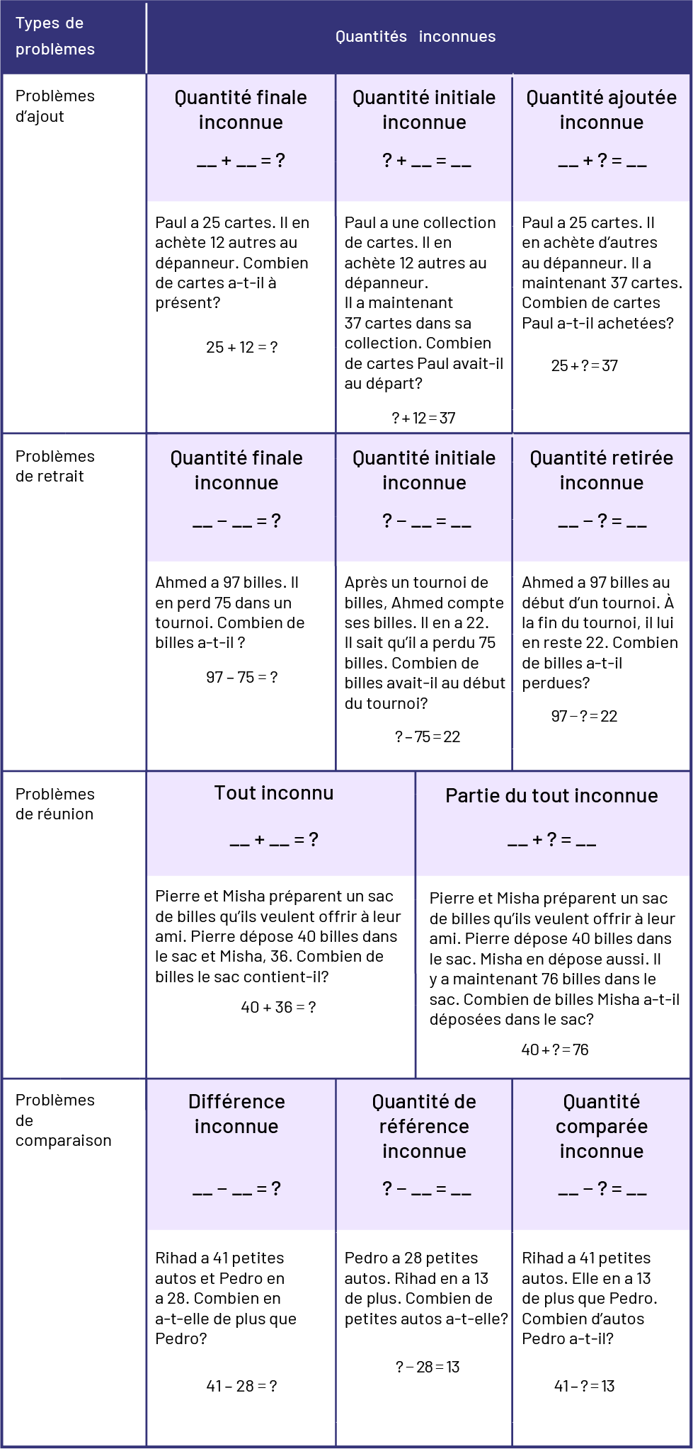 Image Le tableau s'intitule « Types de problèmes relatifs à l'addition et à la soustraction ». Il présente deux colonnes : « Types de problèmes », qui possède toujours une seule case, et « Quantités inconnues », qui possède deux ou trois cases. Premier type de problème : problèmes d'ajout. Sous « Quantités inconnues », il y a trois cases. Première case : Quantité finale inconnue. Tiret plus tiret égale point d'interrogation. Paul a 25 cartes. Il en achète 12 autres au dépanneur. Combien de cartes a-t-il à présent? 25 plus 12 égale point d'interrogation. Deuxième case : Quantité initiale inconnue. Point d'interrogation plus tiret égale tiret. Paul a une collection de cartes. Il en achète 12 autres au dépanneur. Il a maintenant 37 cartes dans sa collection. Combien de cartes Paul avait-il au départ? Point d'interrogation plus douze égale 37. Troisième case : Quantité ajoutée inconnue. Tiret plus point d'interrogation égale tiret. Paul a 25 cartes. Il en achète d'autres au dépanneur. Il a maintenant 37 cartes. Combien de cartes Paul a-t-il achetées? 25 plus point d'interrogation égale 37. Deuxième type de problème : problèmes de retrait. Sous « quantités inconnues », il y a trois cases. Première case : Quantité finale inconnue. Tiret moins tiret égale point d'interrogation. Ahmed a 97 billes. Il en perd 75 dans un tournoi. Combien de billes a-t-il? 97 moins 75 égale point d'interrogation. Deuxième case : Quantité initiale inconnue. Point d'interrogation moins tiret égale tiret. Après un tournoi de billes, Ahmed compte ses billes. Il en a 22. Il sait qu'il a perdu 75 billes. Combien de billes avait-il au début du tournoi? Point d'interrogation moins 75 égale 22. Troisième case : Quantité retirée inconnue. Tiret moins point d'interrogation égale tiret. Ahmed a 97 billes au début d'un tournoi. À la fin du tournoi, il lui en reste 22. Combien de billes a-t-il perdues? 97 moins point d'interrogation égale 22. Troisième type de problème : Problèmes de réunion. Sous « quantités inconnues », il y a deux cases. Première case : Tout inconnu. Tiret plus tiret égale point d'interrogation. Pierre et Misha préparent un sac de billes qu'ils veulent offrir à leur ami. Pierre dépose 40 billes dans le sac et Misha, 36. Combien de billes le sac contient-il? 40 plus 36 égale point d'interrogation. Deuxième case : Partie du tout inconnue. Tiret plus point d'interrogation égale tiret. Pierre et Misha préparent un sac de billes qu'ils veulent offrir à leur ami. Pierre dépose 40 billes dans le sac. Misha en dépose aussi. Il y a maintenant 76 billes dans le sac. Combien de billes Misha a-t-il déposées dans le sac? 40 plus point d'interrogation égale 76. Quatrième type de problème : Problèmes de comparaison. Sous « quantités inconnues », il y a trois cases. Première case : Différence inconnue. Tiret moins tiret égale point d'interrogation. Rihad a 41 petites autos et Pedro en a 28. Combien en a-t-elle de plus que Pedro? 41 moins 28 égale point d'interrogation. Deuxième case : Quantité de référence inconnue. Point d'interrogation moins tiret égale tiret. Pedro a 28 petites autos. Rihad en a 13 de plus. Combien de petites autos a-t-elle? Point d'interrogation moins 28 égale 13. Troisième case : Quantité comparée inconnue. Tiret moins point d'interrogation égale tiret. Rihad a 41 petites autos. Elle en a 13 de plus que Pedro. Combien d'autos Pedro a-t-il? 41 moins point d'interrogation égale 13.