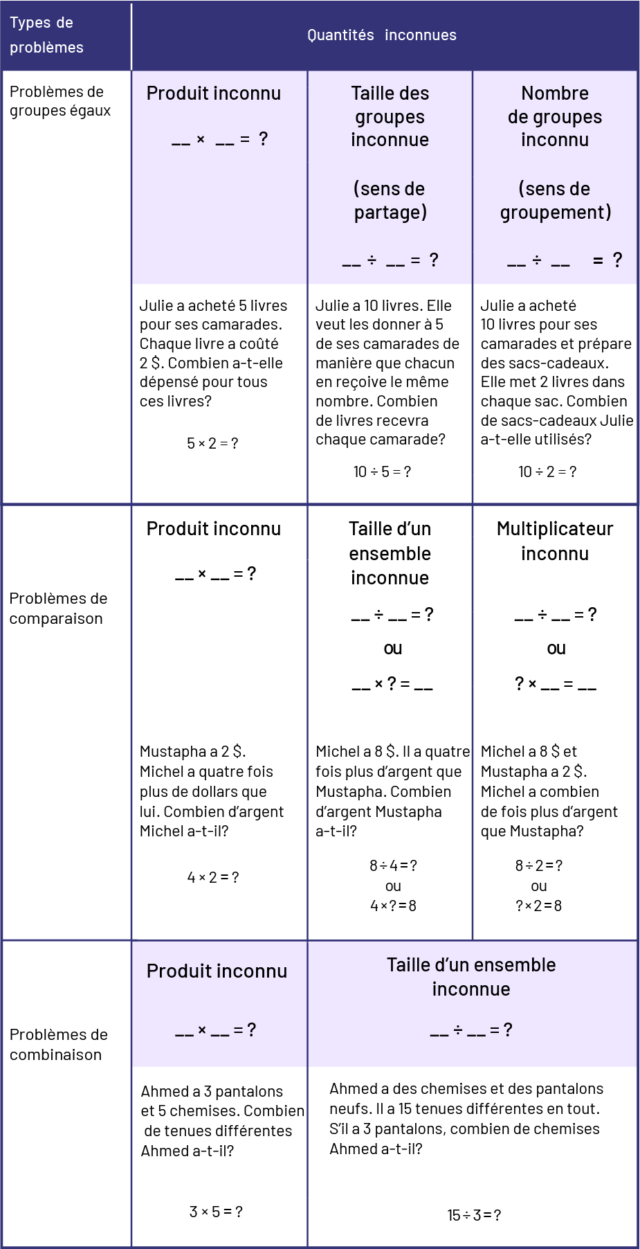 Image Le tableau s'intitule « Types de problèmes relatifs à la multiplication et à la division ». Il présente deux colonnes : « Types de problèmes », qui possède toujours une seule case, et « Quantités inconnues », qui possède deux ou trois cases. Premier type de problème : Problèmes de groupes égaux. Sous « Quantités inconnues », il y a trois cases. Première case : Produit inconnu. Tiret fois tiret égale point d'interrogation. Julie a acheté cinq livres pour ses camarades. Chaque livre a coûté deux dollars. Combien a-t-elle dépensé pour tous ces livres? Cinq fois deux égale point d'interrogation. Deuxième case : Tailles des groupes inconnue, sens de partage. Tiret divisé par tiret égale point d'interrogation. Julie a dix livres. Elle veut les donner à cinq de ses camarades de manière que chacun en reçoive le même nombre. Combien de livres recevra chaque camarade? Dix divisé par cinq égale point d'interrogation. Troisième case : Nombre de groupes inconnu, sens de regroupement. Tiret divisé par tiret égale point d'interrogation. Julie a acheté dix livres pour ses camarades et prépare des sacs-cadeaux. Elle met deux livres dans chaque sac. Combien de sacs-cadeaux Julie a-t-elle utilisés? Dix divisé par deux égale point d'interrogation. Deuxième type de problème : Problèmes de comparaison. Sous « Quantités inconnues », il y a trois cases. Première case : Produit inconnu. Tiret fois tiret égale point d'interrogation. Mustapha a deux dollars. Michel a quatre fois plus de dollars que lui. Combien d'argent Michel a-t-il? Quatre fois deux égale point d'interrogation. Deuxième case : Taille d'un ensemble inconnue. Tiret divisé par tiret égale point d'interrogation ou tiret fois point d'interrogation égale tiret. Michel a huit dollars. Il a quatre fois plus d'argent que Mustapha. Combien d'argent Mustapha a-t-il? Huit divisé par quatre égale point d'interrogation ou quatre fois point d'interrogation égale huit. Troisième case : Multiplicateur inconnu. Tiret divisé par tiret égale point d'interrogation ou point d'interrogation fois tiret égale tiret. Michel a huit dollars et Mustapha a deux dollars. Michel a combien de fois plus d'argent que Mustapha? Huit divisé par deux égale point d'interrogation ou point d'interrogation fois deux égale huit. Troisième type de problème : Problèmes de combinaison. Sous « Quantités inconnues », il y a deux cases. Première case : Produit inconnu. Tiret fois tiret égale point d'interrogation. Ahmed a trois pantalons et cinq chemises. Combien de tenues différentes Ahmed a-t-il? Trois fois cinq égale point d'interrogation. Deuxième case : Taille d'un ensemble inconnue. Tiret divisé par tiret égale point d'interrogation. Ahmed a des chemises et des pantalons neufs. Il a 15 tenues différentes en tout. S'il a trois pantalons, combien de chemises Ahmed a-t-il? 15 divisé par trois égale point d'interrogation.