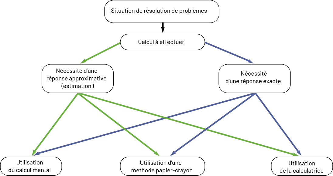 Que ce soit un problème comportant une opération ou plus d’une opération, les élèves doivent prendre des décisions et faire des choix en fonction du contexte. Une approche axée sur la résolution de problèmes les initiera à cette réflexion. Devant un problème, il faut d’abord l’analyser afin d’en déterminer les données et de comprendre qu’un calcul doit être effectué. Ensuite, il faut savoir si, selon le contexte, on cherche une réponse approximative ou une réponse exacte. Dans les deux cas, selon le contexte et les nombres en cause, il faut ensuite déterminer si le calcul sera effectué mentalement, par écrit ou à l’aide d’une calculatrice. Enfin, le calcul désiré est effectué.