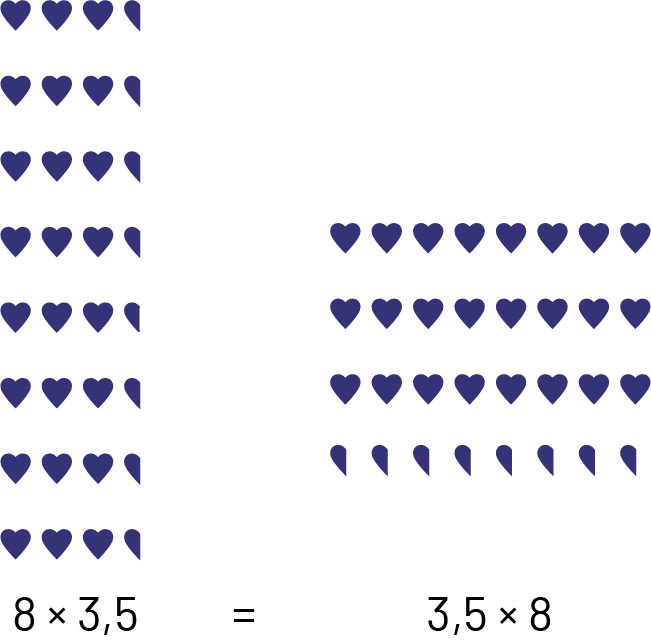Image Deux ensembles de petits coeurs bleus sont placés côte à côte. Le premier ensemble est constitué de trois colonnes de huit cœurs et d’une colonne de huit demi-cœurs. En dessous, il est écrit : huit fois trois virgule cinq. Le deuxième ensemble est constitué de trois rangées de huit cœurs et d’une rangée de huit demi-cœurs. En dessous, il est écrit : trois virgule cinq fois huit.
