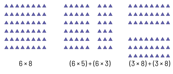 Image Trois images sont placées côte à côte. La première image montre huit colonnes de six triangles bleus. En dessous, il est écrit : six fois huit. La deuxième image montre deux ensembles côte à côte : un ensemble de cinq colonnes de six triangles et un ensemble de trois colonnes de six triangles. En dessous, il est écrit : parenthèse ouvrante six fois cinq parenthèse fermante plus parenthèse ouvrante six fois trois parenthèse fermante. La troisième image montre deux ensembles l’un sous l’autre : ce sont deux ensembles identiques de trois rangées de huit triangles. En dessous, il est écrit : parenthèse ouvrante trois fois huit parenthèse fermante plus parenthèse ouvrante trois fois huit parenthèse fermante.