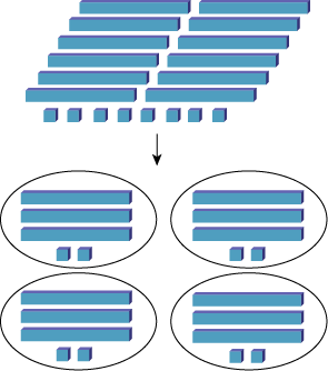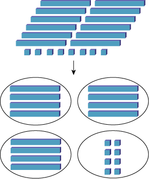 Image Un ensemble de réglettes est composé de douze longues réglettes et de huit petites réglettes en forme de cube. Une flèche pointe vers quatre ensembles de réglettes en dessous. Les trois premiers ensembles contiennent quatre longues réglettes et le quatrième ensemble contient huit petites réglettes cubes. Toutes les réglettes sont bleues.