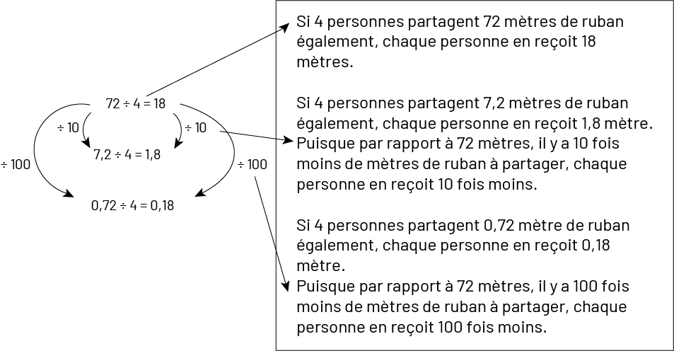 Image Trois divisions sont placées l'une sous l'autre, et à côté d'elles, un rectangle contient des explications textuelles.Première division : 72 divisé par quatre égale 18. Explication : Si quatre personnes partagent 72 mètres de ruban également, chaque personne en reçoit 18 mètres.Une flèche relie 72 au dividende de la deuxième division, et une flèche relie 18 au quotient de la deuxième division; toutes deux indiquent « divisé par dix ».Aussi, une flèche relie 72 au dividende de la troisième division, et une flèche relie 18 au quotient de la troisième division; toutes deux indiquent « divisé par cent ».Deuxième division : sept virgule deux divisé par quatre égale un virgule huit. Explication : Si quatre personnes partagent sept virgule deux mètres de ruban également, chaque personne en reçoit un virgule huit mètre. Puisque par rapport à 72 mètres, il y a dix fois moins de mètres que de ruban à partager, chaque personne en reçoit dix fois moins.Troisième division : zéro virgule 72 divisé par quatre égale zéro virgule 18. Explication : Si quatre personnes partagent zéro virgule 72 mètre de ruban également, chaque personne en reçoit zéro virgule 18 mètre. Puisque par rapport à 72 mètres, il y a cent fois moins de mètres de ruban à partager, chaque personne en reçoit cent fois moins.