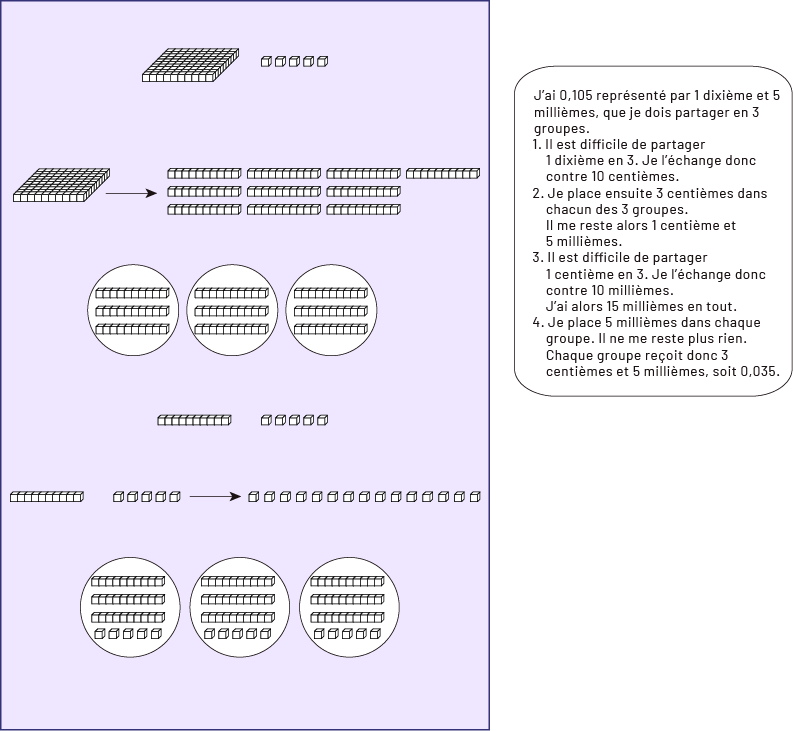 Image Dans un rectangle, le problème à résoudre est illustré par des réglettes. Un encadré à côté décompose textuellement le problème. L'encadré textuel dit : « J'ai zéro virgule 105 représenté par un dixième et cinq millièmes, que je dois partager en trois groupes. » L'illustration montre une grille de cent cubes unités, avec cinq cubes unités individuels à côté. L'encadré textuel dit : « Un : Il est difficile de partager un dixième en trois. Je l'échange donc contre dix centièmes. » L'illustration montre une grille de cent unités qui pointe à droite avec une flèche vers dix tours de dix unités. L'encadré textuel dit : « Deux : Je place ensuite trois centièmes dans chacun des trois groupes. Il me reste alors un centième et cinq millièmes. » L'illustration montre trois ensembles de trois tours de dix unités. En dessous, il y a une tour de dix unités et cinq cubes unités individuels. L'encadré textuel dit : « Trois : Il est difficile de partager un centième en trois. Je l'échange donc contre dix millièmes. J'ai alors 15 millièmes. » L'illustration montre une tour de dix unités, puis cinq unités individuelles qui pointent avec une flèche vers 15 unités individuelles. L'encadré textuel dit : « Quatre : Je place cinq millièmes dans chaque groupe. Il ne me reste plus rien. Chaque groupe reçoit donc trois centièmes et cinq millièmes, soit zéro virgule zéro trois cinq. » L'illustration montre trois ensembles de trois tours de dix unités et de cinq unités individuelles.
