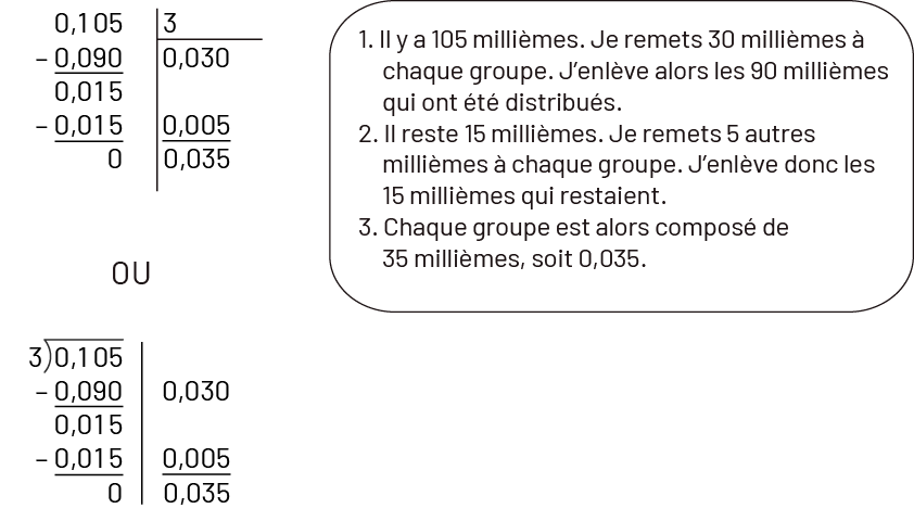 Image Deux divisions écrites et résolues au long sont accompagnées d’un encadré textuel qui décrit le problème. Première division : zéro virgule 105 divisé par trois. Sous le dividende, il est écrit : moins zéro virgule 90 égale zéro virgule zéro quinze moins zéro virgule zéro quinze égale zéro. Sous le diviseur, il est écrit : zéro virgule zéro 30 plus zéro virgule zéro zéro cinq égale zéro virgule zéro 35. Deuxième division : trois divisé par zéro virgule 105. Première colonne : moins zéro virgule zéro 90 égale zéro virgule zéro 15 moins zéro virgule zéro quinze égale zéro. Deuxième colonne : zéro virgule zéro 30 plus zéro virgule zéro zéro cinq égale zéro virgule zéro 35. L’encadré textuel dit : Un : Il y a 105 millièmes. Je remets 30 millièmes à chaque groupe. J’enlève alors les 90 millièmes qui ont été distribués. Deux : Il me reste 15 millièmes. Je remets cinq autres millièmes à chaque groupe. J’enlève donc les 15 millièmes qui restaient. Trois : Chaque groupe est alors composé de 35 millièmes, soit zéro virgule zéro 35.