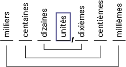 Image Le schéma se présente comme suit : milliers, centaines, dizaines, unités, virgule, dixièmes, centièmes, millièmes. Le mot « unités » est encadré. Les mots « milliers » et « millièmes » sont réunis par un trait, de même que les mots « centaines » et « centièmes », ainsi que « dizaines » et « dixièmes ».