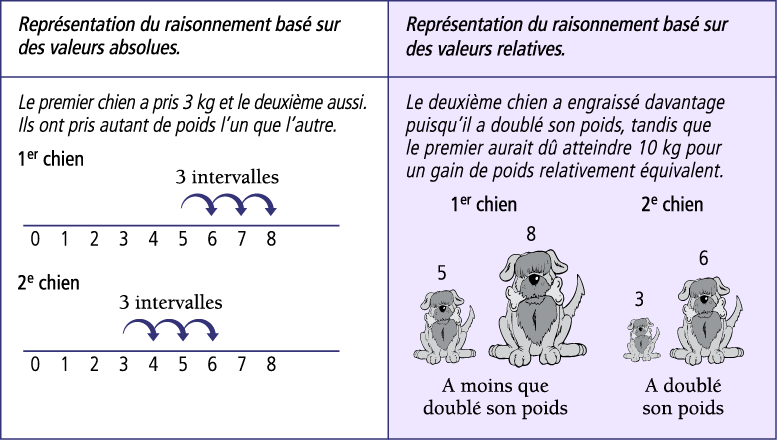 Image Un tableau est divisé en deux. Première partie : « Représentation du raisonnement basé sur des valeurs absolues. » « Le premier chien a pris trois kilos et le deuxième aussi. Ils ont pris autant de poids l’un que l'autre. » Associée au premier chien, la droite numérique est graduée de zéro à huit. Trois flèches relient respectivement cinq à six, six à sept et sept à huit en indiquant « trois intervalles ». Associée au deuxième chien, la droite numérique est graduée de zéro à huit. Trois flèches relient respectivement trois à quatre, quatre à cinq et cinq à six en indiquant « trois intervalles ». Deuxième partie : « Représentation du raisonnement basé sur des valeurs relatives. » « Le deuxième chien a engraissé davantage puisqu’il a doublé son poids, tandis que le premier aurait dû atteindre dix kilos pour un gain de poids relativement équivalent. » Pour le premier chien, il y a l’image d’un chien moyen, qui indique cinq, et d’un gros chien, qui indique huit. Il est écrit « A moins que doublé son poids ». Pour le deuxième chien, il y a l’image d’un petit chien, qui indique trois, et d’un moyen-gros chien, qui indique six. Il est écrit « A doublé son poids ».