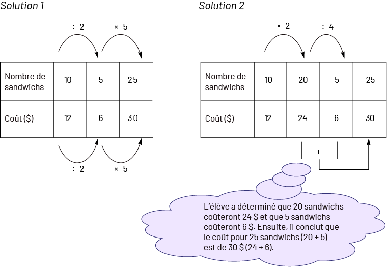Image Solution un. Le tableau indique dans une rangée le nombre de sandwichs, et dans une autre rangée, le coût en dollars. Nombre de sandwichs : dix, cinq, 25. Une flèche va de dix à cinq en indiquant divisé par deux, et une flèche va de cinq à 25 en indiquant fois cinq. Cout : douze, six, trente. Une flèche va de douze à six en indiquant divisé par deux, et une flèche va de six à trente en indiquant fois cinq. Solution deux. Le tableau porte également sur le nombre de sandwichs et le coût en dollars. Nombre de sandwichs : dix, vingt, cinq, 25. Une flèche va de dix à vingt en indiquant fois deux. Une flèche va de vingt à cinq en indiquant divisé par quatre. Coût : douze, 24, six, trente. 24 s’unit à huit avec le symbole plus, qui lui se lie à trente avec une flèche. Ce dernier émet un phylactère de pensée qui dit : L’élève a déterminé que vingt sandwichs coûteront 24 dollars et que cinq sandwichs coûteront six dollars. Ensuite, il conclut que le coût pour 25 sandwichs, vinqt plus cinq, st de trente dollars, 24 plus huit.