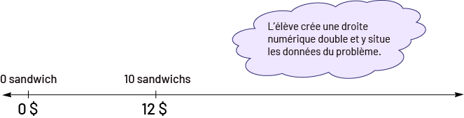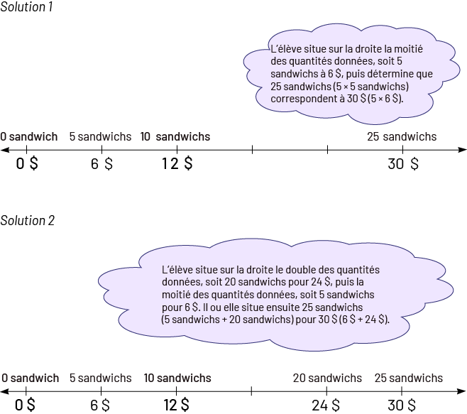 Image Solution un. Une droite numérique indique zéro dollar, six dollars, douze dollars et trente dollars. Au-dessus de zéro il est écrit zéro sandwich, au-dessus de six il est écrit cinq sandwichs, au-dessus de douze il est écrit dix sandwichs et au-dessus de 30 il est écrit 25 sandwichs. Au-dessus de la droite, il y a un nuage dans lequel il est écrit : L’élève situe sur la droite la moitié des quantités données, soit cinq sandwichs à six dollars, puis détermine que 25 sandwichs, cinq fois cinq sandwichs, correspondent à 30 dollars, cinq fois six dollars. Solution deux. Une droite numérique indique zéro dollar, six dollars, douze dollars, 24 dollars et 30 dollars. Au-dessus de zéro il est écrit zéro sandwich, au-dessus de six il est écrit cinq sandwichs, au-dessus de douze il est écrit dix sandwichs, au-dessus de 24 il est écrit vingt sandwichs, et au-dessus de 30 il est écrit 25 sandwichs. Au-dessus de la droite, il y a un nuage dans lequel il est écrit : L’élève situe sur la droite le double des quantités données, soit vingt sandwichs pour 24 dollars, puis la moitié des quantités données, soit cinq sandwichs pour six dollars. Il ou elle situe ensuite 25 sandwichs, cinq sandwichs plus vingt sandwichs, pour trente dollars, six dollars plus 24 dollars.