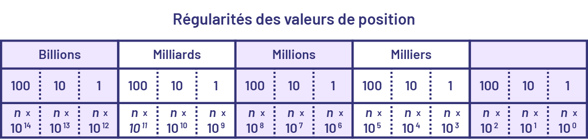 Image Le tableau s’intitule Régularités des valeurs de position. Il présente les valeurs suivantes : billions,
