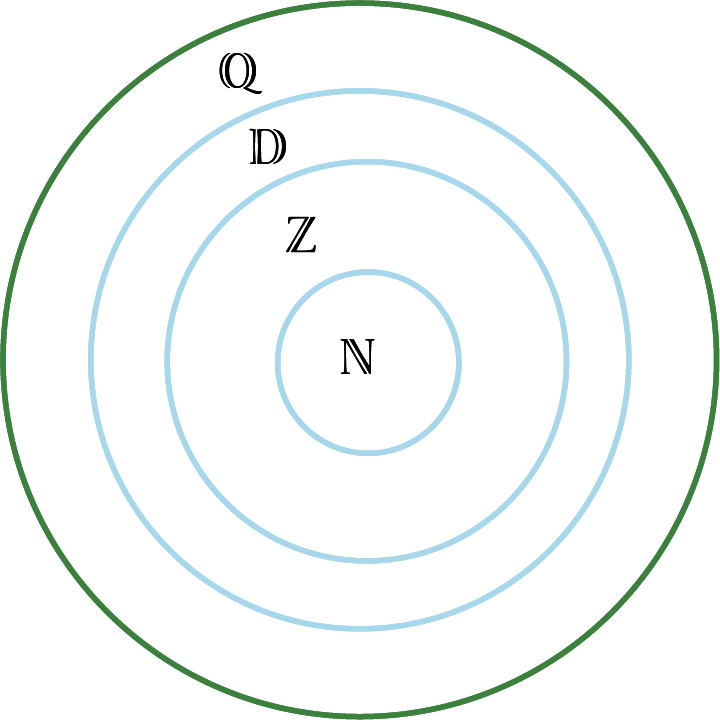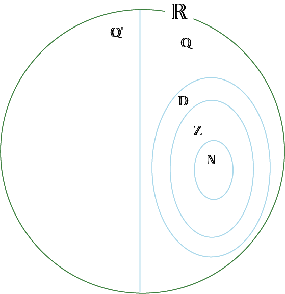 Image Un grand cercle vert représente les nombres réels. Il est divisé en deux parties égales par une ligne verticale. Dans la partie de gauche, il est écrit « Q » prime. Dans la partie de droite, il est écrit « Q » au-dessus d'un ovale bleu contenant la lettre « D », lequel contient un plus petit ovale bleu contenant la lettre « Z », lequel contient un plus petit ovale bleu contenant la lettre « N ».