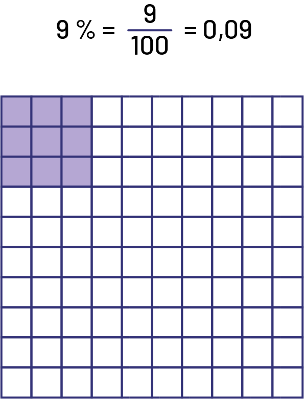 Image Dans une grille de cent unités, les neuf unités formant un carré dans le coin supérieur gauche sont violettes tandis que le reste des unités est blanc. Au-dessus de la grille, il est écrit : neuf pourcent égale neuf sur cent égale zéro virgule zéro neuf.