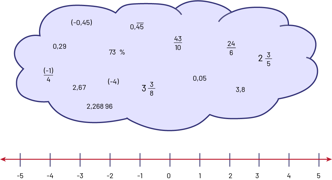 Image Au-dessus d’une double droite numérique graduée de moins cinq à cinq, il y a un nuage contenant plusieurs types de nombres, comme des fractions, des nombres décimaux, des nombres entre parenthèses, etc.
