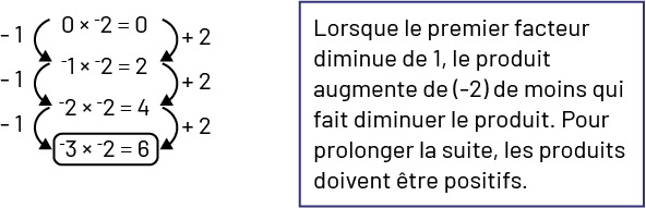 Image Quatre multiplications sont présentées l’une sous l’autre. Première multiplication : zéro fois deux égale zéro. Deuxième multiplication : moins un fois moins deux égale deux. Une flèche relie le facteur zéro de la première multiplication au facteur moins un de la deuxième en indiquant moins un. Une flèche relie le produit zéro de la première multiplication au produit deux de la deuxième en indiquant plus deux. Troisième multiplication : moins deux fois moins deux égale quatre. Une flèche relie le facteur moins deux de la troisième en indiquant moins un. Une flèche relie le produit deux de la deuxième multiplication au produit quatre de la troisième en indiquant plus deux. Quatrième multiplication, encadrée : moins trois fois moins deux égale six. Une flèche relie le facteur moins deux de la troisième multiplication au facteur moins trois de la quatrième en indiquant moins un. Une flèche relie le produit quatre de la troisième multiplication au produit six de la quatrième en indiquant plus deux. Un encadré textuel dit : Lorsque le premier facteur diminue d’un, le produit augmente de moins deux de moins qui fait diminuer le produit. Pour prolonger la suite, les produits doivent être positifs