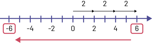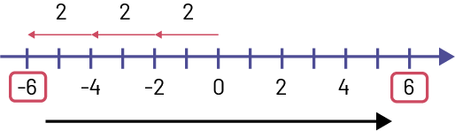 Image Une droite numérique est graduée de moins six à six. Au-dessus de la droite, une flèche relie zéro à moins deux en indiquant deux. Une flèche relie moins deux à moins quatre en indiquant deux. Et une flèche relie moins quatre à moins six en indiquant deux.Moins six et six sont encadrés en rouge, et une flèche noire relie le premier au deuxième.