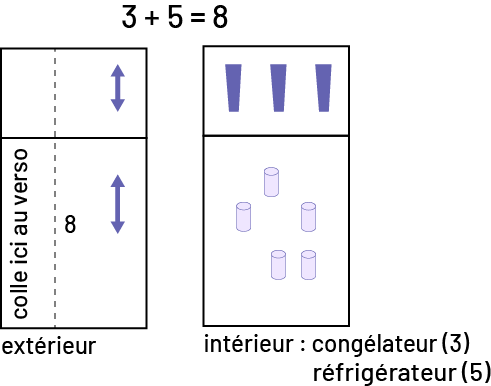 image Deux rectangles placés côte à côte illustrent un réfrigérateur classique pourvu d’un congélateur en haut. Le rectangle de gauche représente l’extérieur et celui de droite représente l’intérieur. Au-dessus des rectangles est écrite l’équation suivante : trois plus cinq égale huit. Le premier rectangle présente deux doubles flèches pointant en haut et en bas, une sur le congélateur et une sur le réfrigérateur. Il y a une ligne pointillée qui le traverse de haut en bas. Du côté gauche de celle-ci, dans la section réfrigérateur, il est écrit « colle ici au verso ». Et à droite de celle-ci, sur la section réfrigérateur, il y a le nombre huit. Sous le rectangle, il est écrit le mot « extérieur ».Le deuxième rectangle présente trois verres de couleur violette dans le congélateur, et cinq cylindres violet pâle dans le réfrigérateur. Sous le rectangle, il est écrit : « intérieur : congélateur trois, réfrigérateur cinq ».