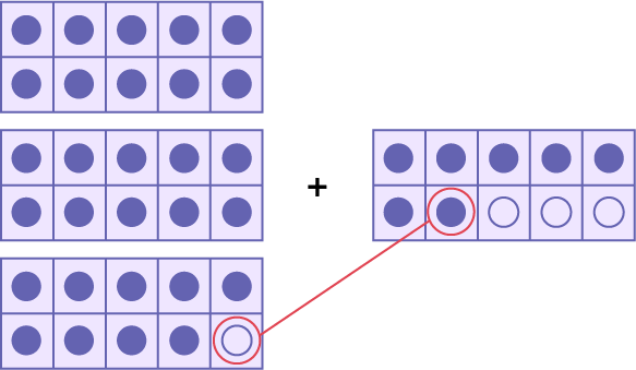 image Quatre rectangles divisés en dix cases chacune munie d’une pastille sont présentés.En haut, il y a un rectangle muni de dix pastilles violettes.Au centre, il y a un rectangle muni de dix pastilles violettes, le symbole « plus », et un autre rectangle, celui-ci muni de sept pastilles violettes et de trois pastilles incolores. La dernière pastille violette est encerclée.En bas, il y a un rectangle muni de neuf pastilles violettes et d’une pastille incolore. Cette dernière est encerclée et reliée par un trait à la pastille encerclée du rectangle précédant.