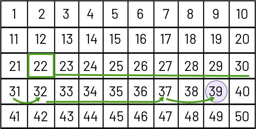 image Une grille est chiffrée d’un à 50, par rangées de dix. Le numéro 22 est encadré de vert. Les numéros de 23 à 30 sont soulignés de vert. Une flèche relie les numéros 31 et 32. Une flèche part du numéro 32 et se rend jusqu’à 37. Une flèche part de 37 et se rend à 39. Le numéro 39 est entouré d’une pastille violette.