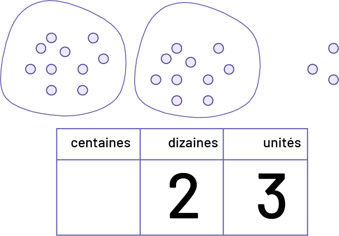 image L’image montre des ensembles de jetons au-dessus d’une grille simple.Deux ensembles de dix jetons sont encerclés, tandis que trois jetons demeurent à part, pour un total de 23 jetons. La grille est divisée en trois parties : centaines, dizaines, unités. Il n’y a aucun chiffre dans la colonne des centaines, il y a le chiffre deux dans la colonne des dizaines, et il y a le chiffre trois dans la colonne des unités.